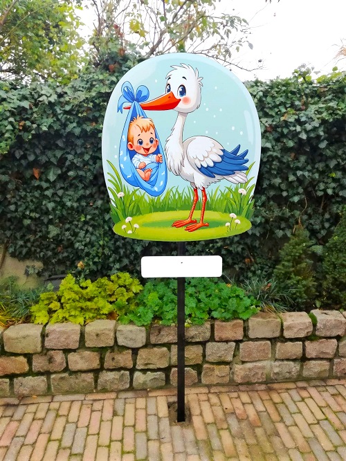 De meeste borden hebben we dan ook in een jongen en meisje uitvoering. Populaire borden zijn bijvoorbeeld de Giraffe jongen, Giraffe meisje, Ooievaar Mint, Beertje jongen, Beertje meisje, Dino, Meisje met strik of een grote ooievaar. Alle geboorteborden worden met een stevige pal geleverd.